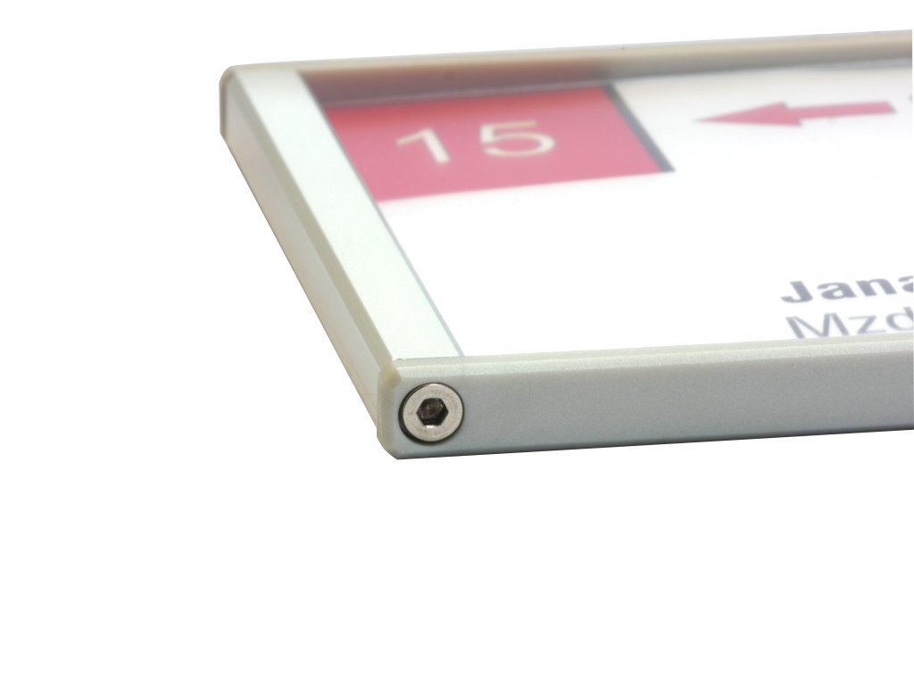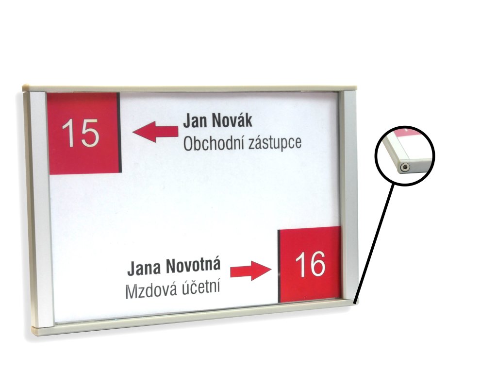 Dveřní tabulky Klassik Plus je dodáván ve stříbrném odstínu eloxovaného hliníku. Nepatrně vypouklý profil s hranatými bočnicemi a jemně sraženými hranami je zakončen plastovými bočnicemi ve světle šedé barvě. Do profilu se vkládá papírový výtisk, který je chráněn krycím antireflexním plastem. Dveřní tabulky Klassik Inox vynikají jednoduchostí výměny vkládaného výtisku pod krycí antireflexní plast, běžný uživatel tak sám obstará aktualizaci tabulky.