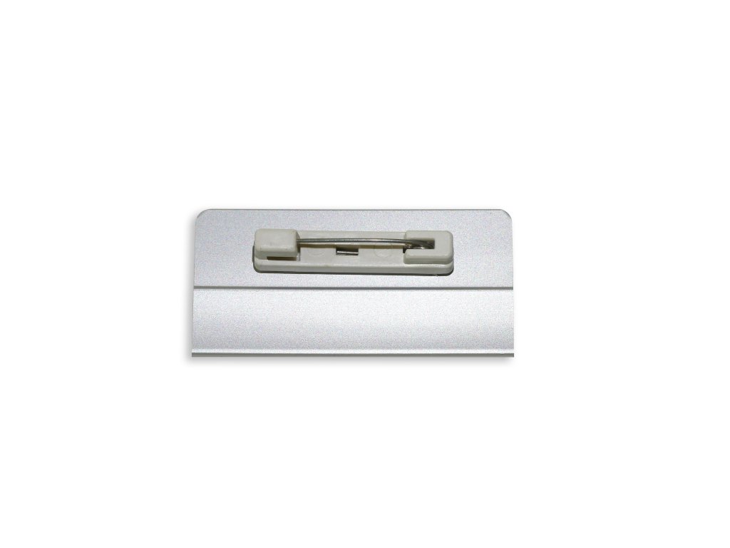 Osobní jmenovka ze stříbrného hliníkového profilu určená k zavěšení na oděv pomocí spínacího špendlíku nebo magnetického klipu. Vlastní popiska - jmenovka může být tištěná, papírová, kryta antireflexní čirou folií, případně gravírována do dvouvrstvého plastu. Zakázkově může být hlavička osobní jmenovky pojednána logem nebo jinou grafikou.