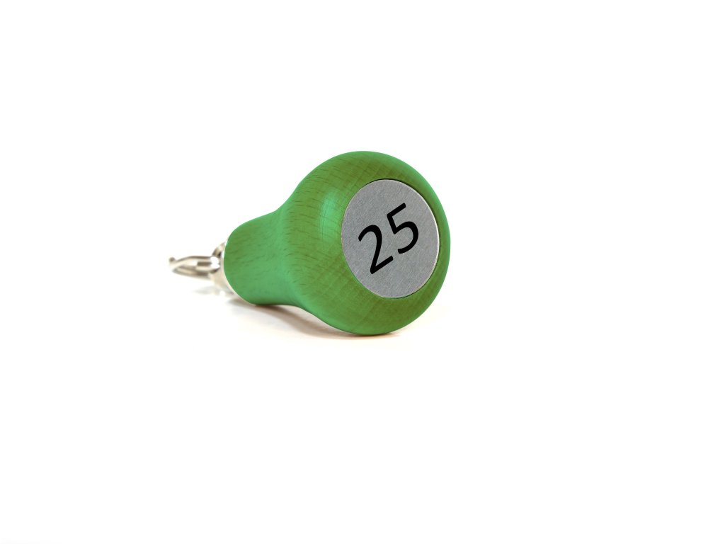 Klíčenka je vyrobena z bukového dřeva. V horní části je kovový úchyt s kroužkem. Spodní strana klíčenky je opatřena kolečkem z broušeného plastu o průměru 24,9mm pro popis gravurou (číselem klíčenky). Vygravírované číslo má černou barvu.
