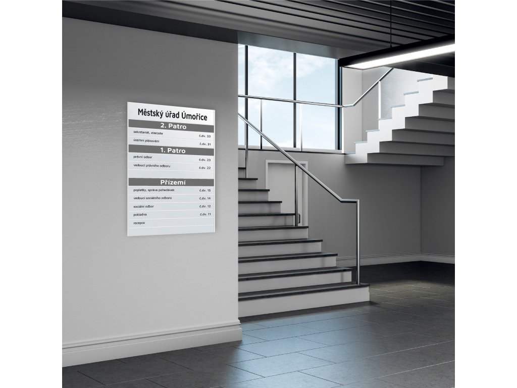 Hlavní orientační (informační) tabule je složena ze stříbrně eloxovaných hliníkových lišt systému INDOOR (ACS), zacvaknutých do vodících lišt nosných bočnic či dělících profilů. Bočnice a dělící profily jsou také ze stříbrně eloxovaného hliníku. Pro snazší montáž je tabule zkompletována a předinstalována na 3mm silné pomocné desce s předvrtanými kotvýcími otvory. Tento produkt je vhodný pojedat samolepící fóliografikou případně UVtiskem či pogravírovat.